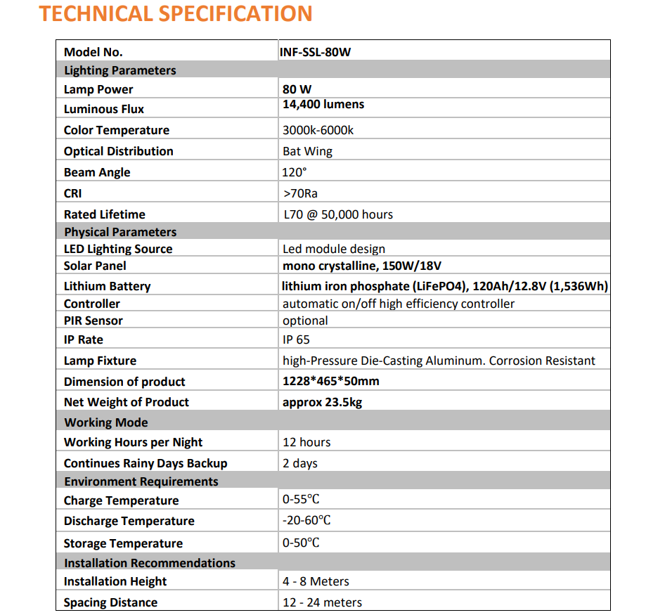 Built in an all-in-one compact design, the INF-SSL-80W integrates the solar panel, lithium battery, and LED lamp into a single unit, making installation quick, easy, and cost-efficient. Its IP65 weatherproof rating guarantees durability against rain, dust, and harsh outdoor conditions, ensuring long-term performance with minimal maintenance.