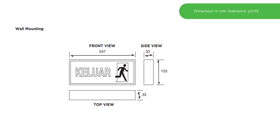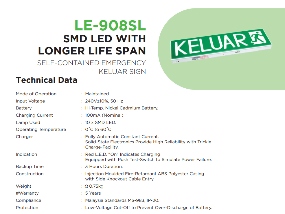 With its bright and clear ‘KELUAR’ display, this emergency sign helps guide occupants safely during emergencies, meeting safety compliance requirements for Malaysian buildings.