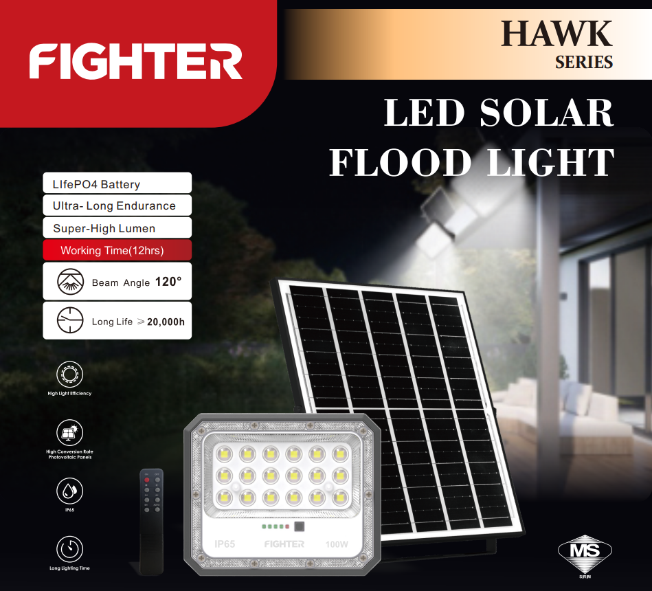 View more about FIGHTER HAWK SERIES LED SOLAR FLOODLIGHT 6500K 20,000HRS IP65 [100W/200W/300W/500W] [400LM/850LM/1100LM/1650LM] on main site