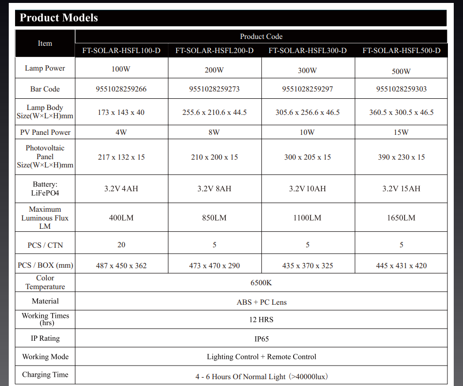 The FIGHTER HAWK Series LED Solar Floodlight 6500K 20,000HRS IP65 [100W/200W/300W/500W] [400LM/850LM/1100LM/1650LM] is a high-performance, energy-saving outdoor lighting solution designed for durability, brightness, and convenience. Powered by solar energy, it eliminates electricity costs while providing reliable illumination for homes, gardens, driveways, parking lots, and security areas.