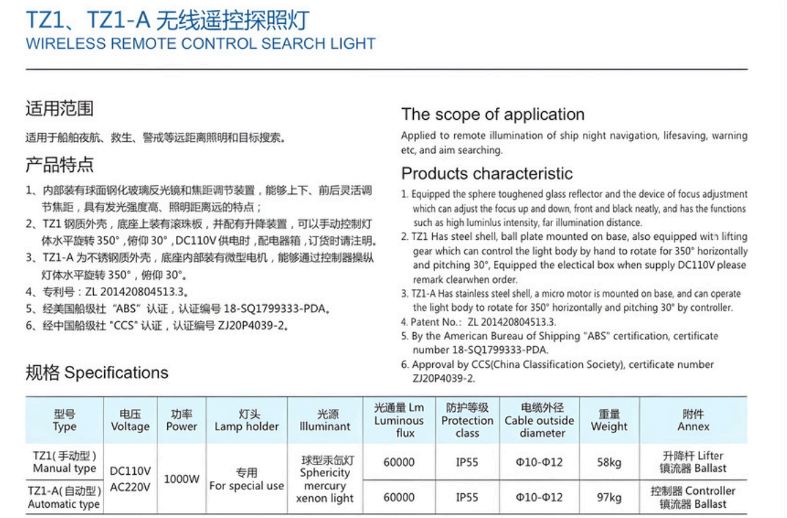 View more about JLUX TZ1 1000W AC220V 60000LM IP44 WATERPROOF 350掳 ROTATION SPHERICITY MERCURY XENON MANUAL SEARCHLIGHT, ABS & CCS CERTIFIED FOR MARINE SHIP NAVIGATION, RESCUE, LIFESAVING, WARNING AND AIR-SEA SEARCHING on main site