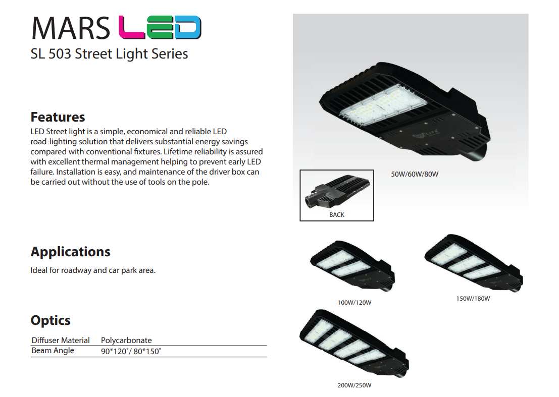 Upgrade your roadway, commercial, and industrial outdoor lighting with the SJLITE SL503 MARS SERIES LED STREETLIGHT 240V 50,000HRS IP65 CRI70 [50W/60W/80W/100W/120W/150W/180W/200W/250W] [6000LM/7200LM/9600LM/12000LM/14400LM/18000LM/21600LM/24000LM/30000LM] [3000K/4000K/6500K]—a high-performance and energy-efficient street lighting solution designed for maximum illumination and long-term reliability.