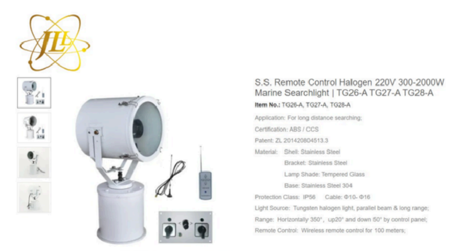 ![JLUX TG27/28-A 220V 6900LM-53000LM IP56 WATERPROOF 350掳 ROTATION SPHERICITY HALOGEN SEARCHLIGHT C/W REMOTE CONTROL, ABS & CCS CERTIFIED FOR MARINE SHIP NAVIGATION, RESCUE, LIFESAVING, WARNING AND AIR-SEA SEARCHING [1000W/2000W] [23000LM/53000LM] [G9.5/GY16]](https://cdn1.npcdn.net/images/ecc514a80747cbcd9f7dbb09a3fff357_1761116306.png?md5id=d0866fb7fef7340334755089f89bdfeb&new_width=1000&new_height=1000&size=max&w=1466647023)