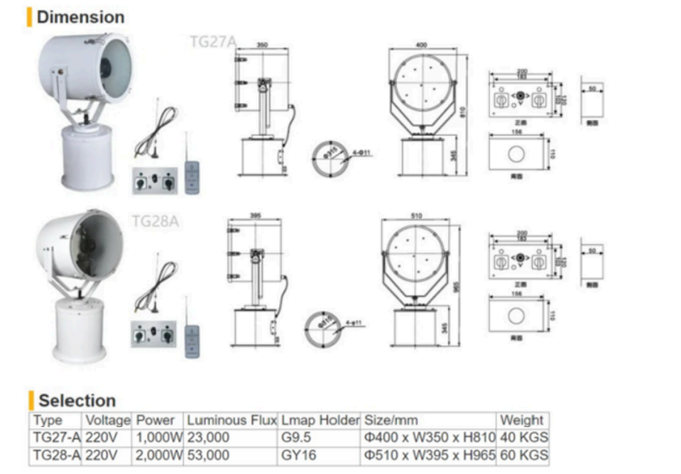 JLUX TG27/28-A 220V 6900LM-53000LM IP56 WATERPROOF 350° ROTATION SPHERICITY HALOGEN SEARCHLIGHT C/W REMOTE CONTROL, ABS & CCS CERTIFIED FOR SHIP NAVIGATION, RESCUE, LIFESAVING, WARNING AND AIR-SEA SEARCHING [1000W/2000W] [23000LM/53000LM] [G9.5/GY16]