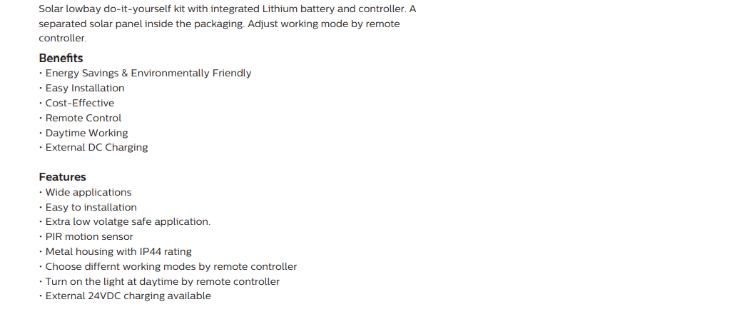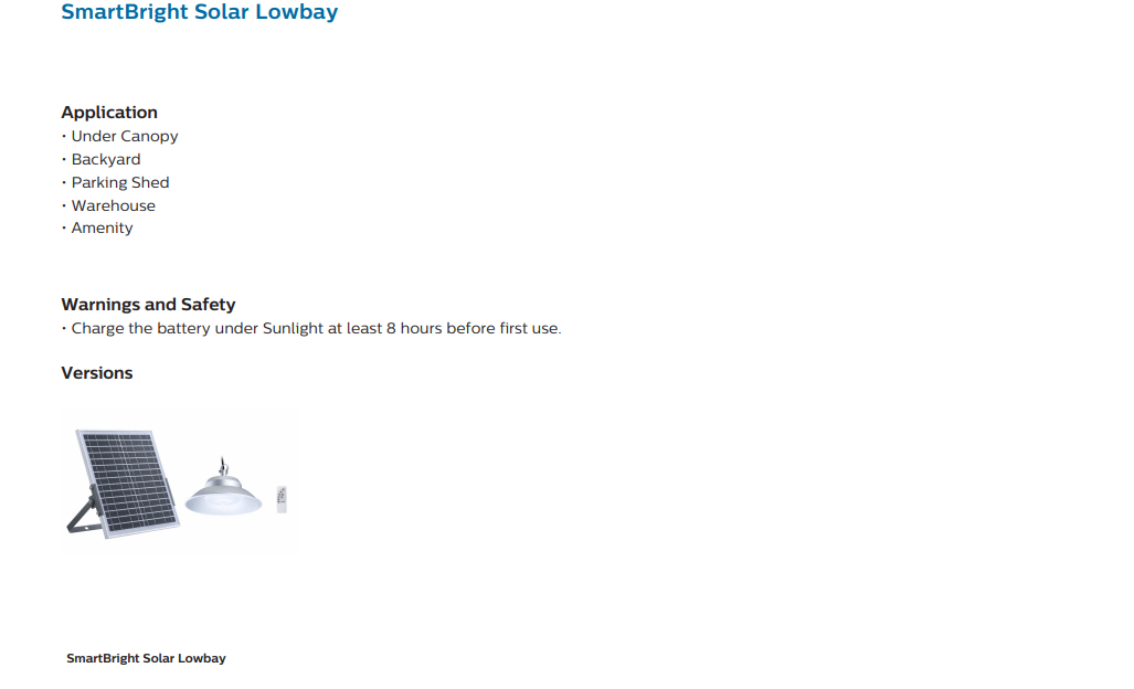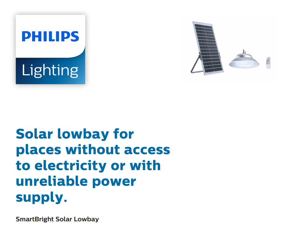 Perfect for warehouses, car parks, corridors, workshops, and outdoor areas, the PHILIPS BY010P Solar Lowbay provides exceptional durability, versatility, and energy efficiency—making it an ideal choice for commercial and industrial lighting projects.