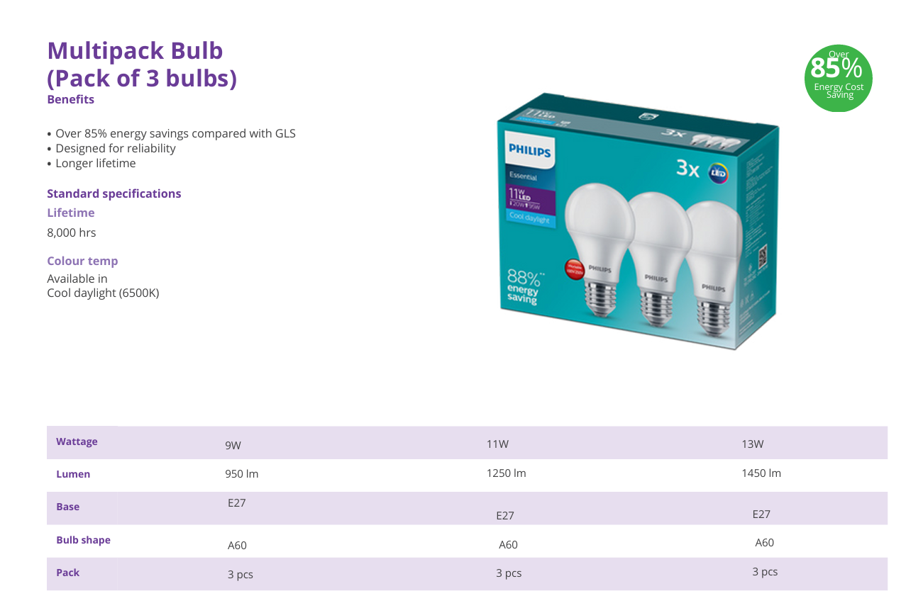 Brighten up your space with the (NEW) PHILIPS MULTIPACK E27 LED BULBS 3x PCS 6500K 8,000HRS [9W/11W/13W] [950LM/1250LM/1450LM], designed to deliver superior brightness, long-lasting performance, and exceptional energy efficiency at an affordable price.