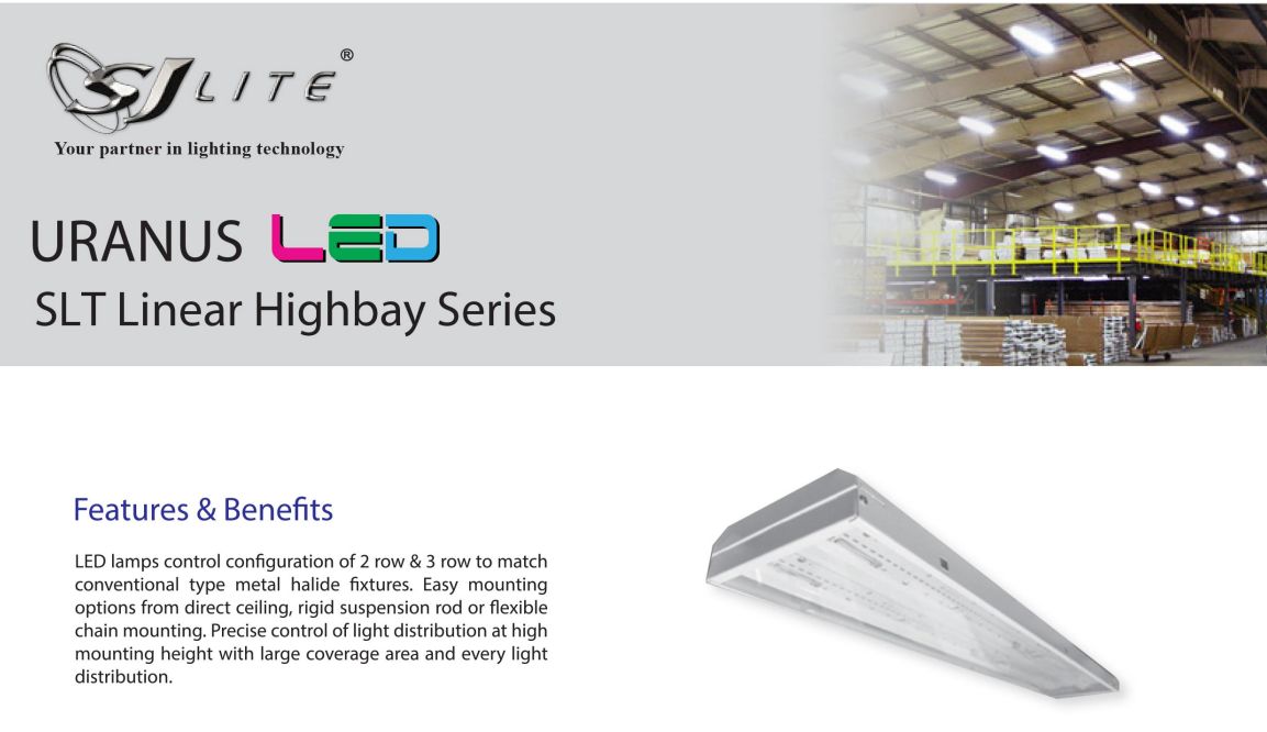 View more about SJLITE SLT URANUS SERIES LED LINEAR HIGHBAY 240V 50,000HRS IP20 CRI80 [1X2W/1X4] [49W/97W/99W/149W] [7100LM/14150LM/15670LM/21750LM] [4000K/6500K] on main site