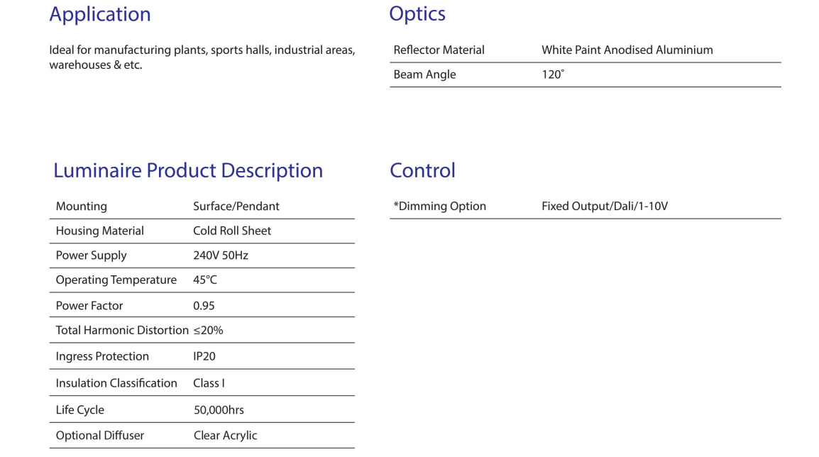 Available in multiple wattage options—49W, 97W, 99W, and 149W—the Uranus Series offers strong lumen output from 7100 to 21750 lumens, ensuring bright visibility even in high-ceiling environments. Its CRI80 rating ensures good colour accuracy, while the selectable 4000K or 6500K colour temperatures allow users to choose between neutral white and daylight illumination.