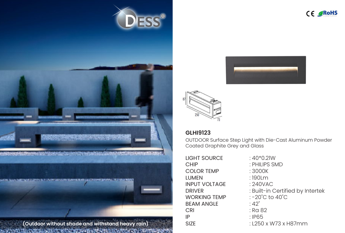 The DESS GLHI9123 OUTDOOR LED WALL LIGHT 240V 8.4W 190LM 3000K IP65 CRI82 is suitable for both residential and commercial applications, including house exteriors, balconies, corridors, patios, fences, and building facades. Its minimalist design blends easily with modern and contemporary architecture while offering long-lasting, low-maintenance performance.