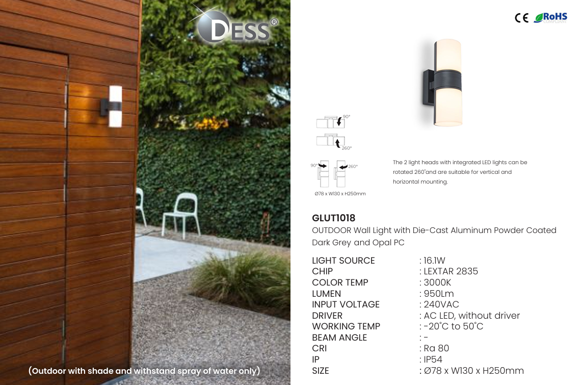 The DESS GLUT1018 OUTDOOR LED WALL LIGHT 240V 16.1W 950LM 3000K IP54 CRI80 is a powerful and reliable lighting solution designed for outdoor residential and commercial environments. With its modern design and high light output, this wall light enhances both safety and aesthetics for exterior spaces.