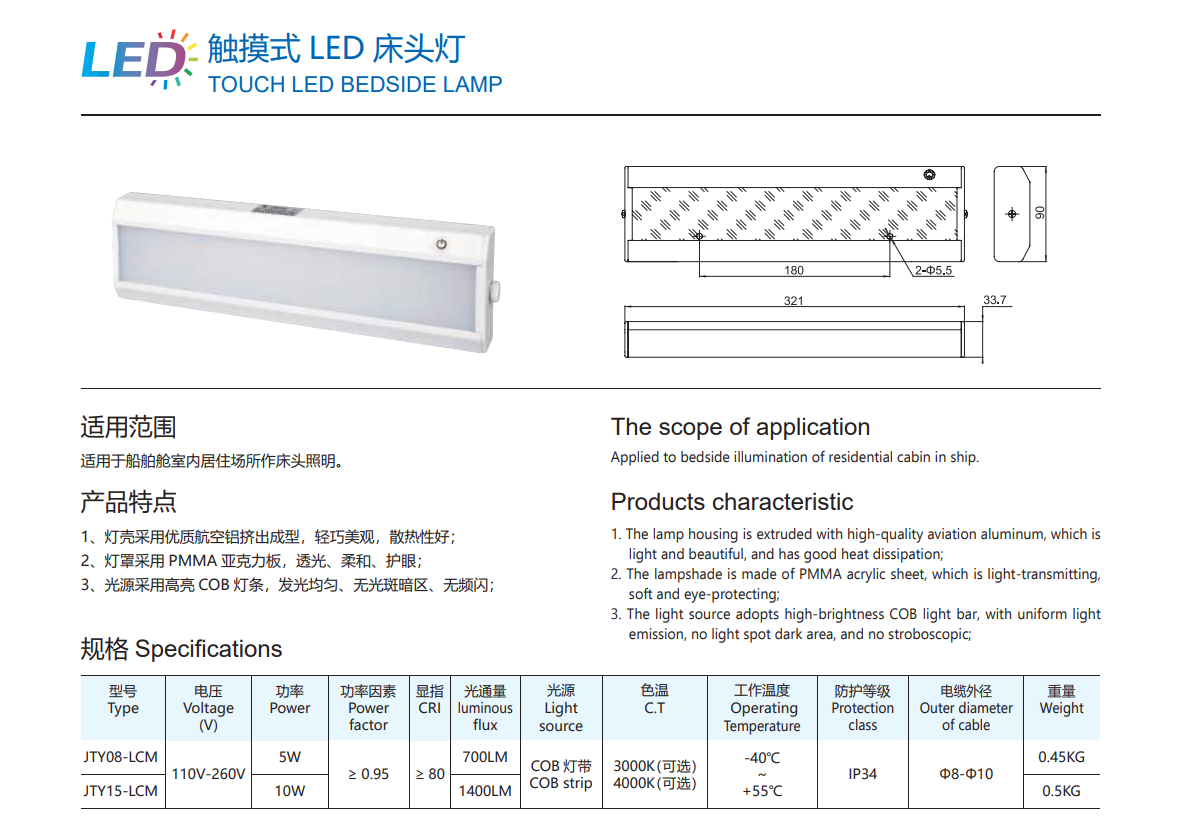 JLUX MARINE OFFSHORE COB TOUCH LED BEDSIDE LAMP 260V IP34 CRI80 [5W/10W] [700LM/1,400LM] [3000K/4000K] [JTY08/JTY15]