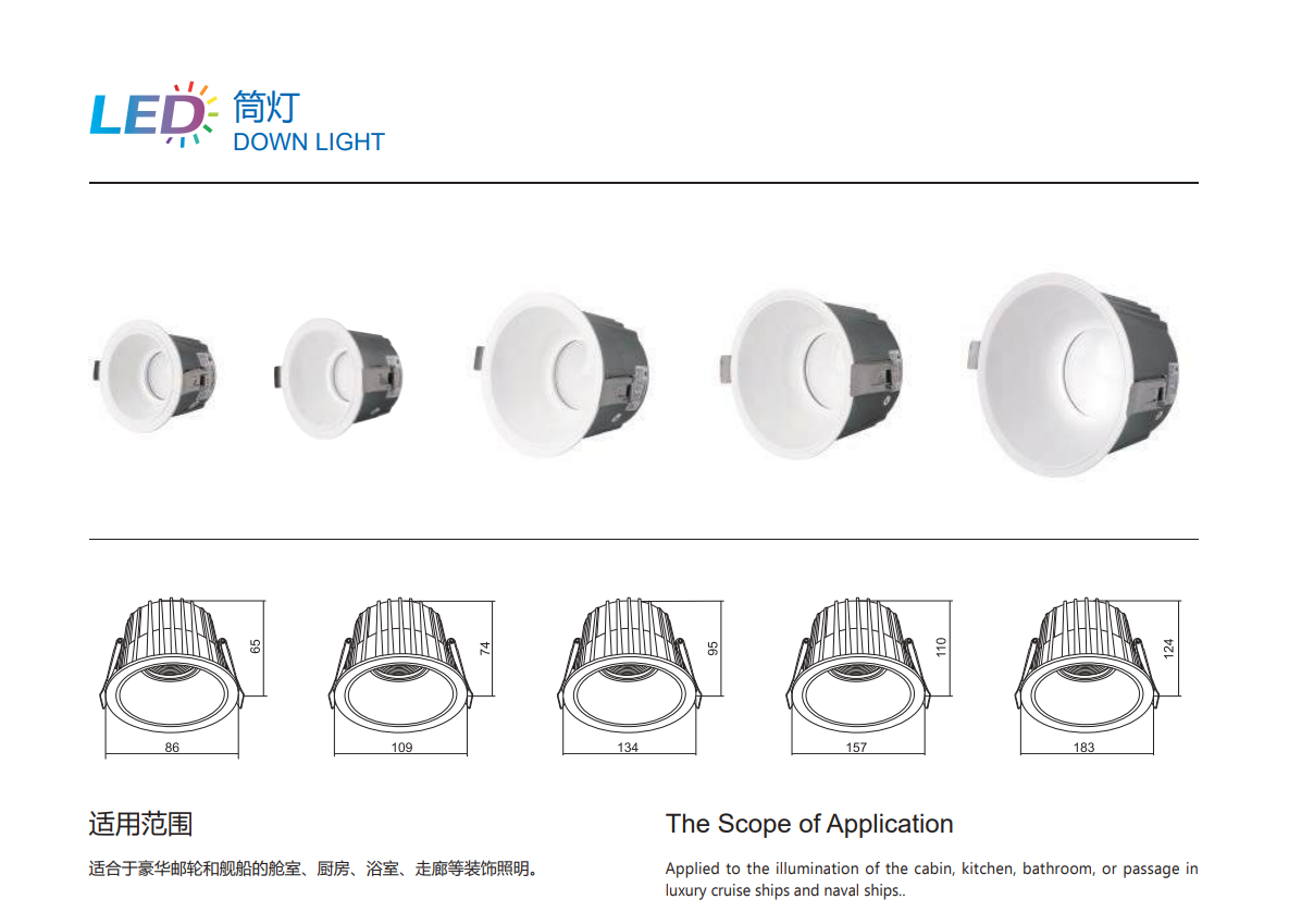 Operating at 265V, this marine downlight offers multiple wattage options ranging from 9W to 40W, delivering high brightness from 1,170 lumens up to 5,200 lumens. The CRI80 color rendering ensures natural and clear lighting, making it suitable for workspaces, accommodation areas, and marine interior lighting applications.