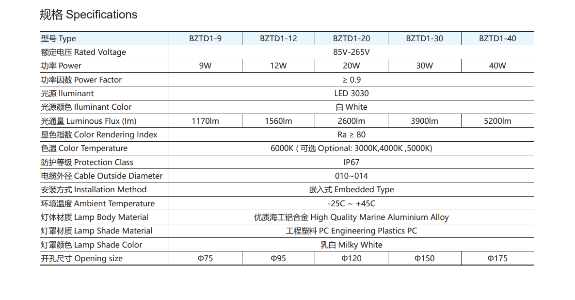 Wattage Options: 9W / 12W / 20W / 30W / 40W
