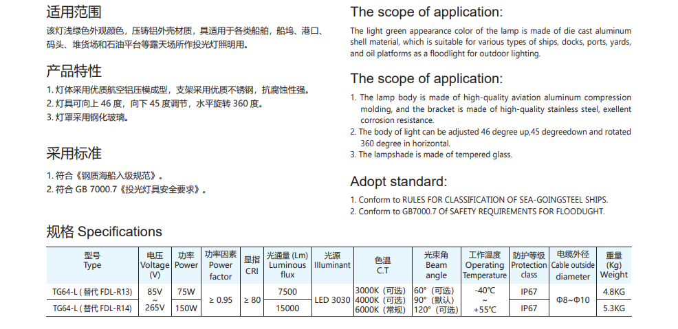 Manufactured under JLUX (OEM), the TG64-L marine spotlight operates at 265V and is available in two high-power options: 75W and 150W, producing 7,500 lumens and 15,000 lumens respectively. This makes it ideal for applications that require strong illumination such as deck lighting, ship exterior lighting, and offshore working areas.