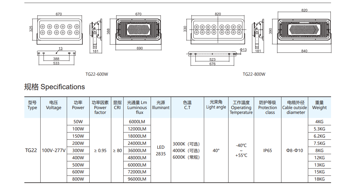 Operating at 277V, the JLUX TG22 floodlight is available in a wide range of power options including 50W, 100W, 150W, 200W, 300W, 400W, 500W, 600W, and 800W, delivering brightness levels from 6,000 lumens up to 96,000 lumens. This wide power range allows users to select the most suitable lighting output depending on the installation area and required illumination level.